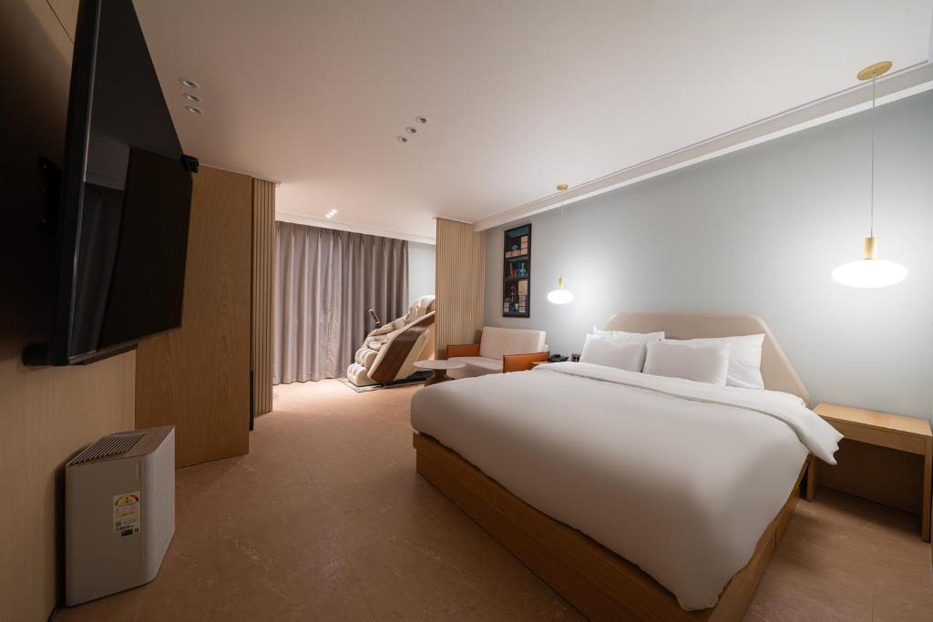 Extremely comfortable stay! Sheets were extremely clean, comfortable and sleep inducing. I upgraded my room type to get the massage bed and massage chair. Its a bit confusing because some photos show 1 or both so I wanted to ask if I should get a massage chair too but decided not to. The massage bed turned out to be used quite a bit so theres no way I would have the time to use the massage chair too. I hope they can update their room description to state clearly. Plus they said it was 10m² which obviously it wasn't, even by the photos. The suite is about 22-24m² with a huge TV and an even larger bathroom. The bathtub is huge and can fit a family with 2 kids easily. Perhaps you can bring some bath bombs here. The massage chair's kneading knobs are so good I want to purchase this Ceragem. Except that it keeps starting at the head so my head got a bit sore. There's also a dryer in the room, which also sterilises your clothes! Life saver because I got food poisoning n vomited all over my clothes. (I washed them in the huge bathroom b4 using the washing machine n dryer.) The waahing machine is also free to use!!! Detergent is provided FOC. It has many modes including AI mode based on level of contamination, quick mode at 18 min, fitness modes etc. However it is a good 15min walk from Unseo station. The station is very good as its in between the Airport stations and Seoul/Hongik stations. Theres also many restaurants and small shops here to explore.
