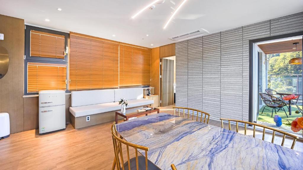 I stayed for one night and two days in the B103 river view room. First of all, there are only 3 rooms per floor, and the spacing between the rooms is wide, so it seemed that the sound insulation between the upper and lower floors is good, allowing me to enjoy my stay comfortably and quietly. The living room is very spacious, and the bedroom space is separate with its own door, which is cozy and well arranged, making it very enjoyable to lie down and admire the river view. I plan to stay here again if I come back to Gapyeong. Additionally, the barbecue facilities are very well equipped, so you only need to prepare your food and come. The barbecue area is located on the third underground terrace, where it wasn't hot, and I was able to enjoy the sunset while eating. The charcoal seemed to be of good quality, allowing the fire to burn evenly, and the meat was deliciously grilled. If I were to mention a couple of minor drawbacks, first, the barbecue area usage application is only available until 7 PM. Although it says usage is allowed until 10 PM, you can only apply until 7 PM, so those planning a short trip nearby after work on Fridays should consider their arrival time carefully. Second, there were pink stains between the bathroom tiles, and when I checked in, there were many fruit flies, possibly due to food disposal by the previous guests or coming from the sink. However, the air conditioning was great, and there were even bamboo toothbrushes as amenities, which offset all the mentioned drawbacks. It was quiet and very nice! I recommend it.