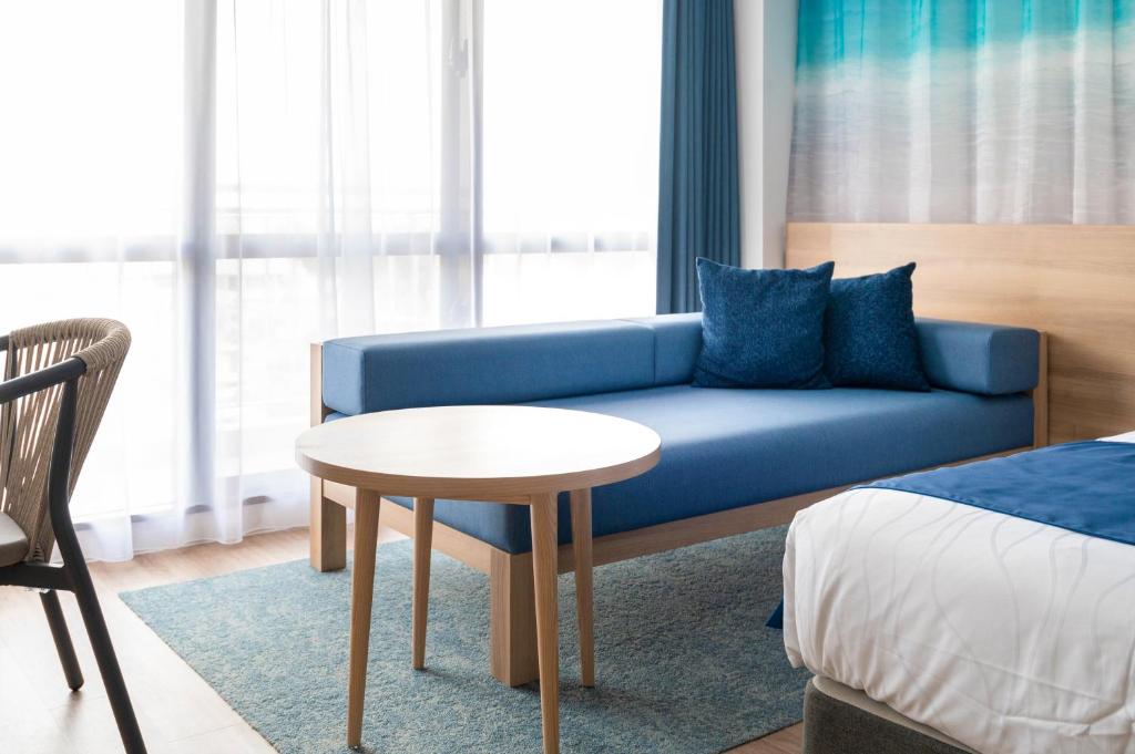 It was close to the bus stop, and right in front of the beach, so I went to enjoy the sunrise and the starry sky. Also, there was a shower next to the pool, which was convenient for changing after snorkeling. A short walk away, there was a FamilyMart and a local supermarket, which helped in getting any forgotten items. The facilities were old, but they had been renovated, and the extra bed was turned into a sofa, which was a clever touch, making the room spacious and comfortable.