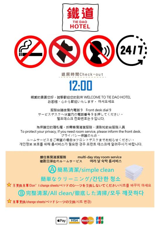 Tie Dao Hotel in Tainan, Taiwan offers a range of convenience facilities to ensure a comfortable and hassle-free stay for its guests. With a laundry service available on-site, guests can easily take care of their laundry needs without having to leave the hotel. Additionally, the hotel provides room service, allowing guests to enjoy delicious meals in the comfort of their own rooms.