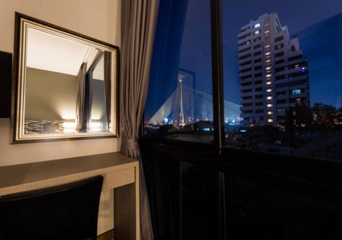 The room is good. The atmosphere is nice. There are restaurants by the Chao Phraya River. It's a pity that the food prices are very expensive for Thai people. Parking is really inconvenient if you come with a car. It's suitable only for those without a car! The room price is 1,100 baht per night. What you get is considered acceptable. There is a hairdryer. A refrigerator that isn't plugged in. A television that can only access general channels. WiFi that doesn't work. The bathroom floor is slippery, so you have to be careful not to fall. The room we received has a view of the neighboring house. You can easily see into the room from the neighbor's house. The view of the Rama 8 Bridge is very beautiful. If you like taking photos, this place is recommended.