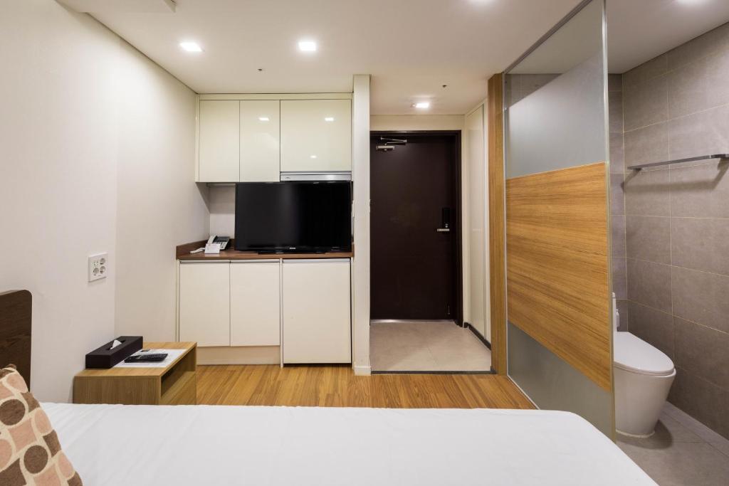 I checked in late while touring, but the staff were very helpful. I booked it cheaply because I was focused on sightseeing and planned to just wash up and sleep. It was just right for me to stay alone. The sink was separate, making it convenient for washing my hands. They provided towels and water for consecutive nights and cleaned up my trash, which was fine as cleaning was not included. One downside was that I wanted to eat takeout at the accommodation but there was no table, so I had to eat on the chair, haha. The underground parking was a bit narrow, and there was an open parking lot next to the entrance, but there were no spots available, maybe because it was the weekend. The open space is large. If I go to Jeju again, I will use it. Thank you!